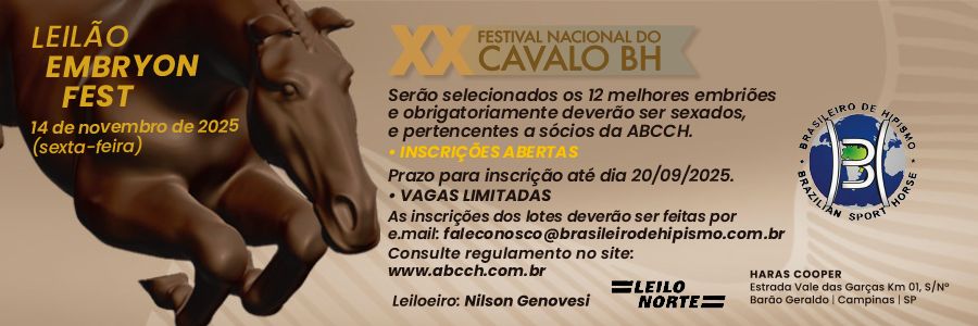 ![]() | 13 de Outubro de 2025 “CORNETINO JMEN” NO TOPO DO BRASILEIROS DE CAVALOS NOVOS 7 ANOS |